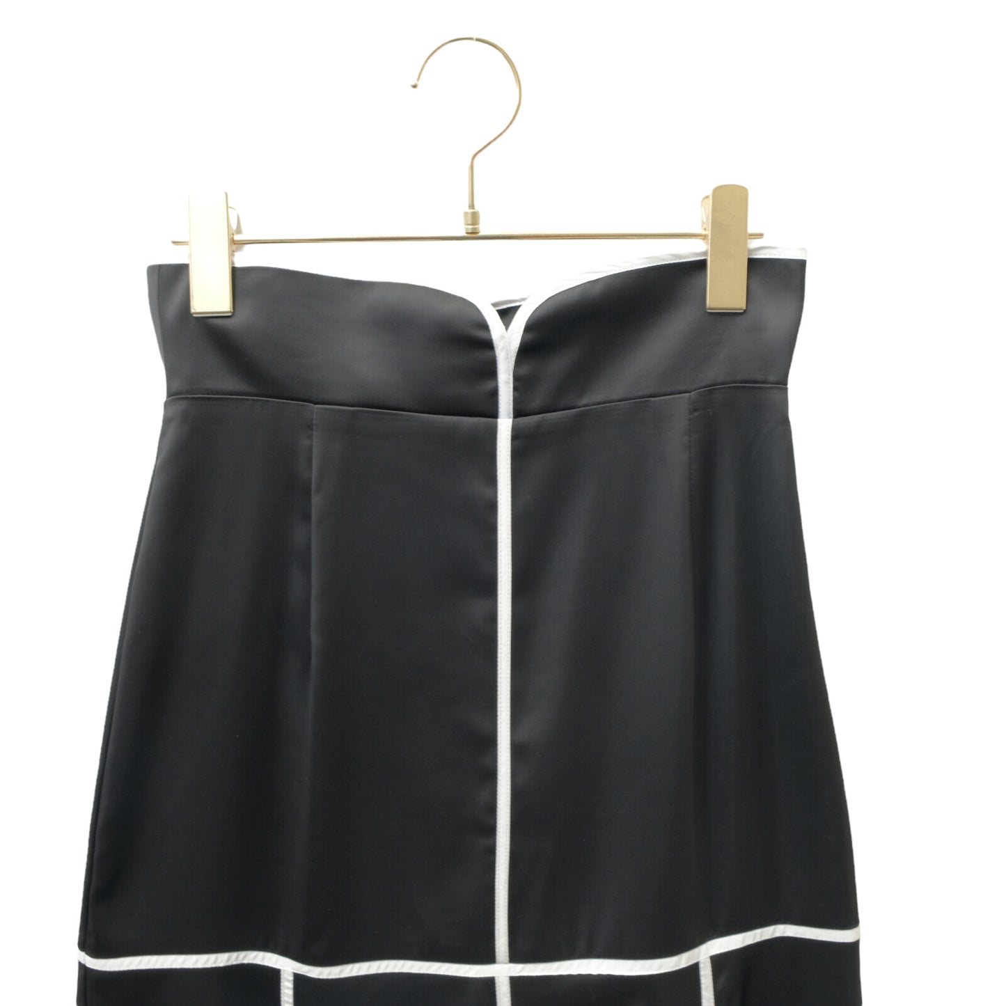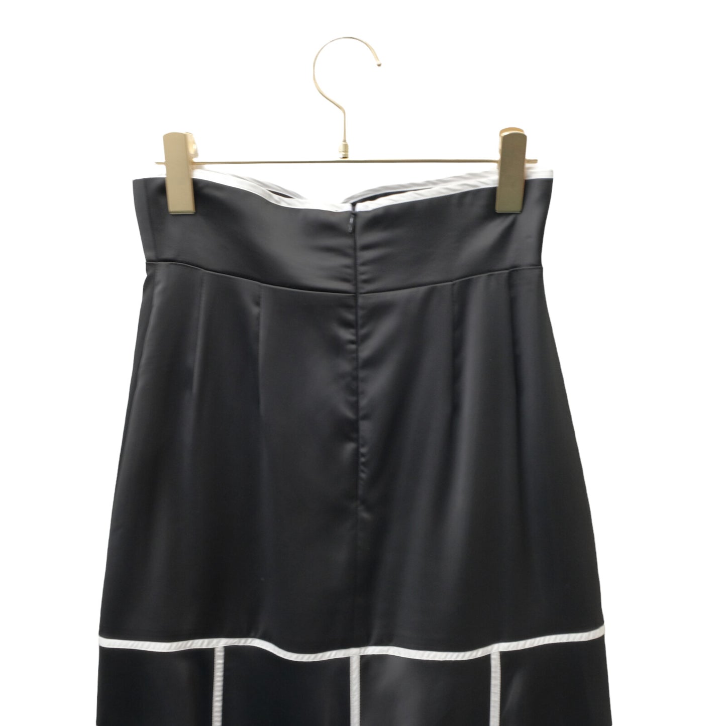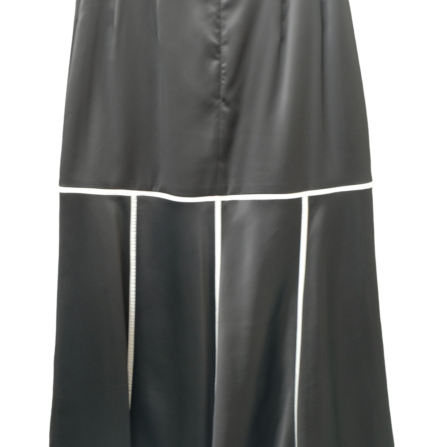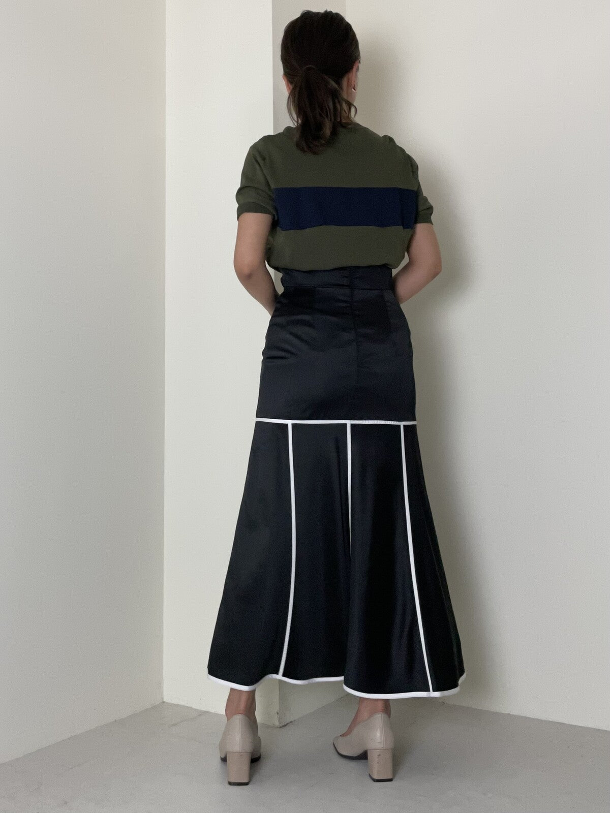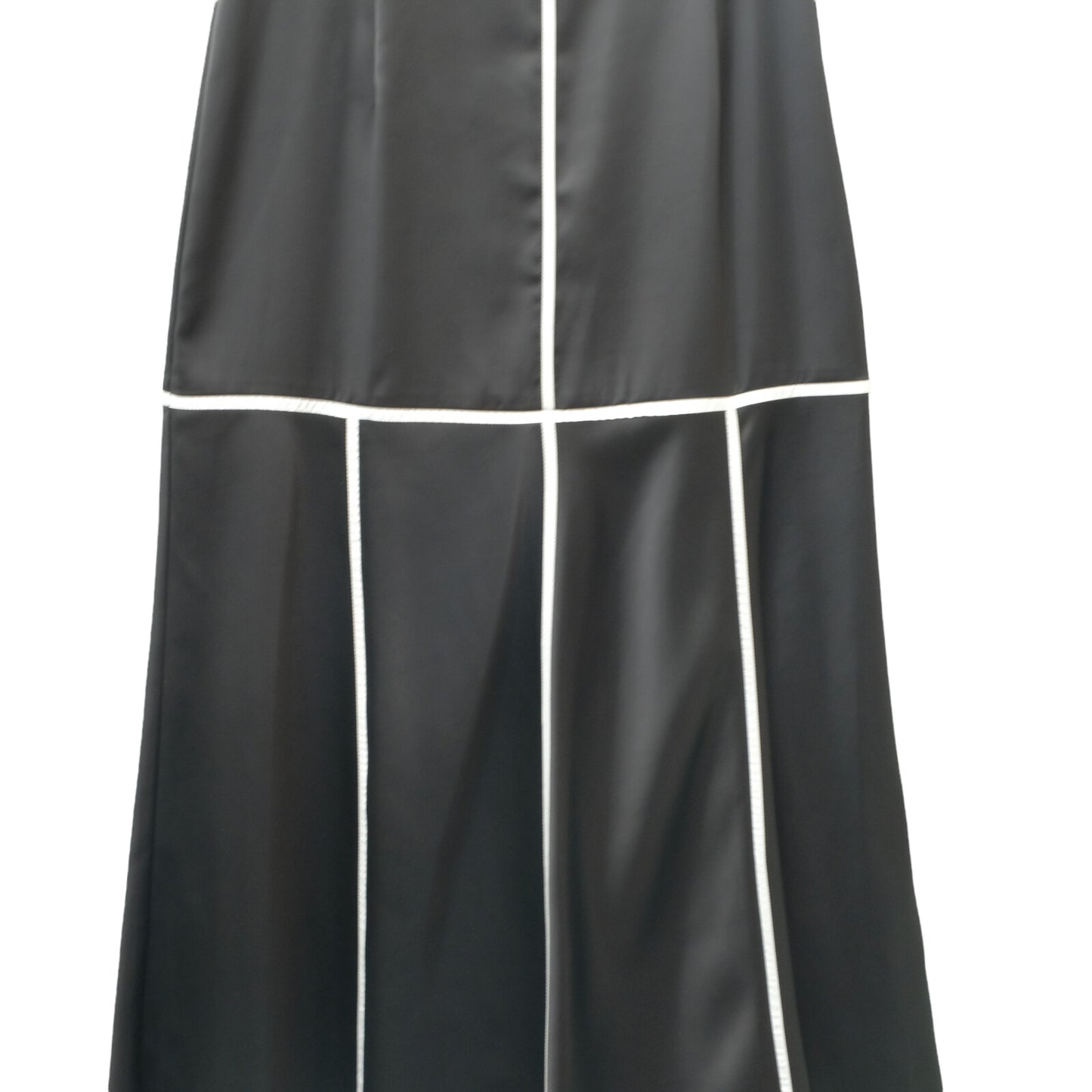 Made of elegant fabric with a glossy and firm texture. The hem sways smoothly as you walk, but the firmness helps maintain a beautiful silhouette. The cut of the front waist is also a unique design. The back waist is elastic, which is a nice feature and makes it easy to wear. We recommend wearing it with a simple top tucked in to highlight the cut of the waist and the piping.