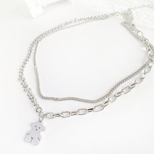FLAT TEDDY BEAR DOUBLE CHAIN NECKLACE SILVER