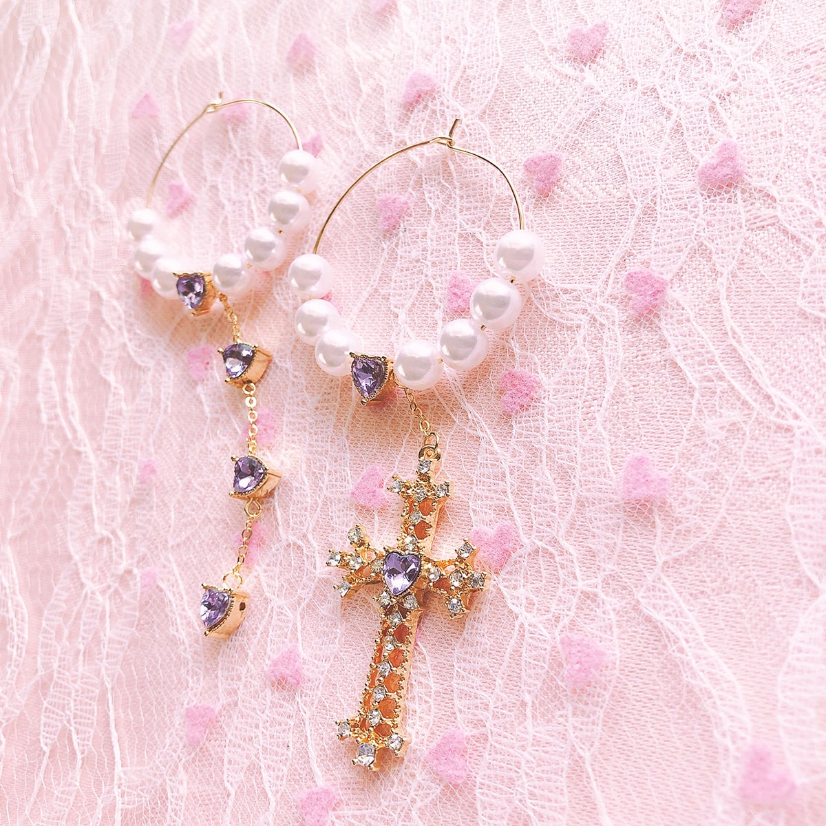 Pearl and mini purple heart, cross motif hoop earrings♡
