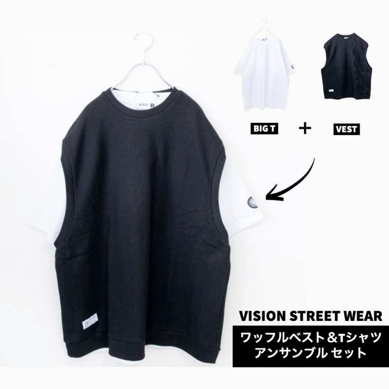 VISION STREET WEAR Waffle Vest & T-Shirt Ensemble Set BLACK