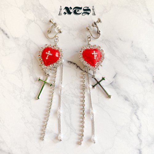 XTS Cross Heart Chain Earrings Silver/Red TS0223