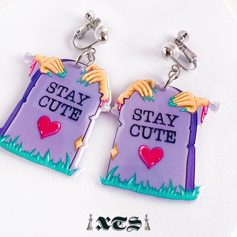 A cute color design featuring a grave motif with the "STAY CUTE" logo, hearts, and zombie hands.