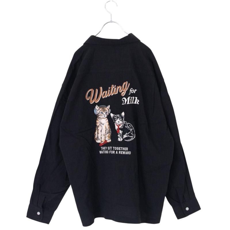 さらっとした麻ライクな生地のシャツに待ち時間を楽しんでいる猫たちの刺繍をON