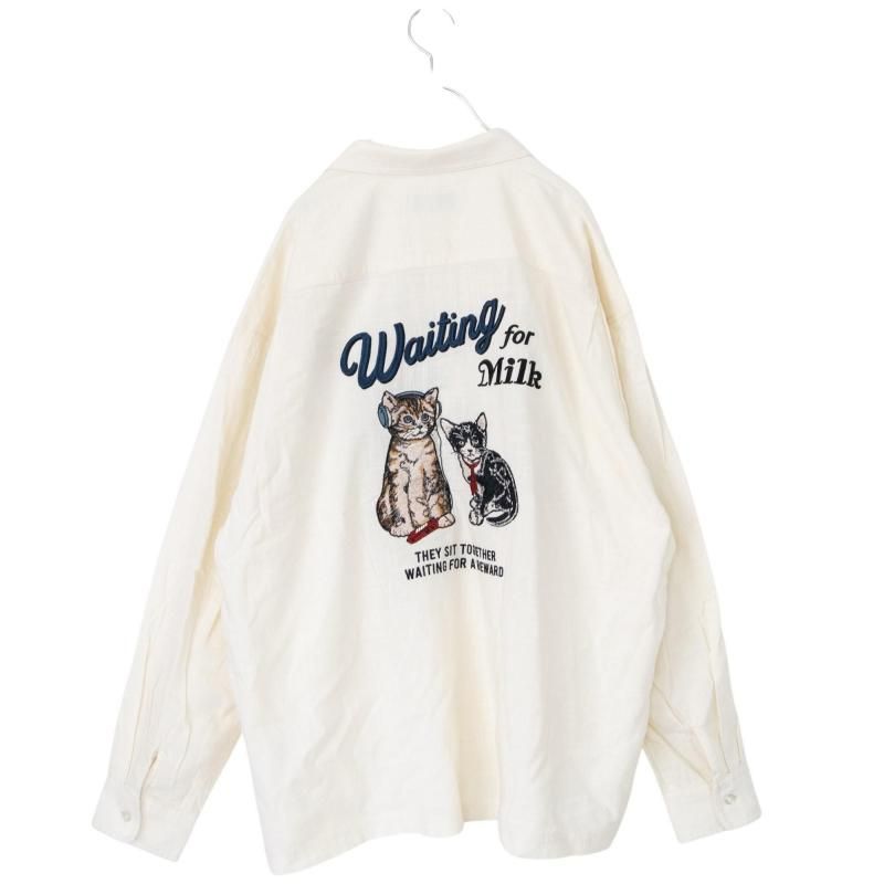 さらっとした麻ライクな生地のシャツに待ち時間を楽しんでいる猫たちの刺繍をON